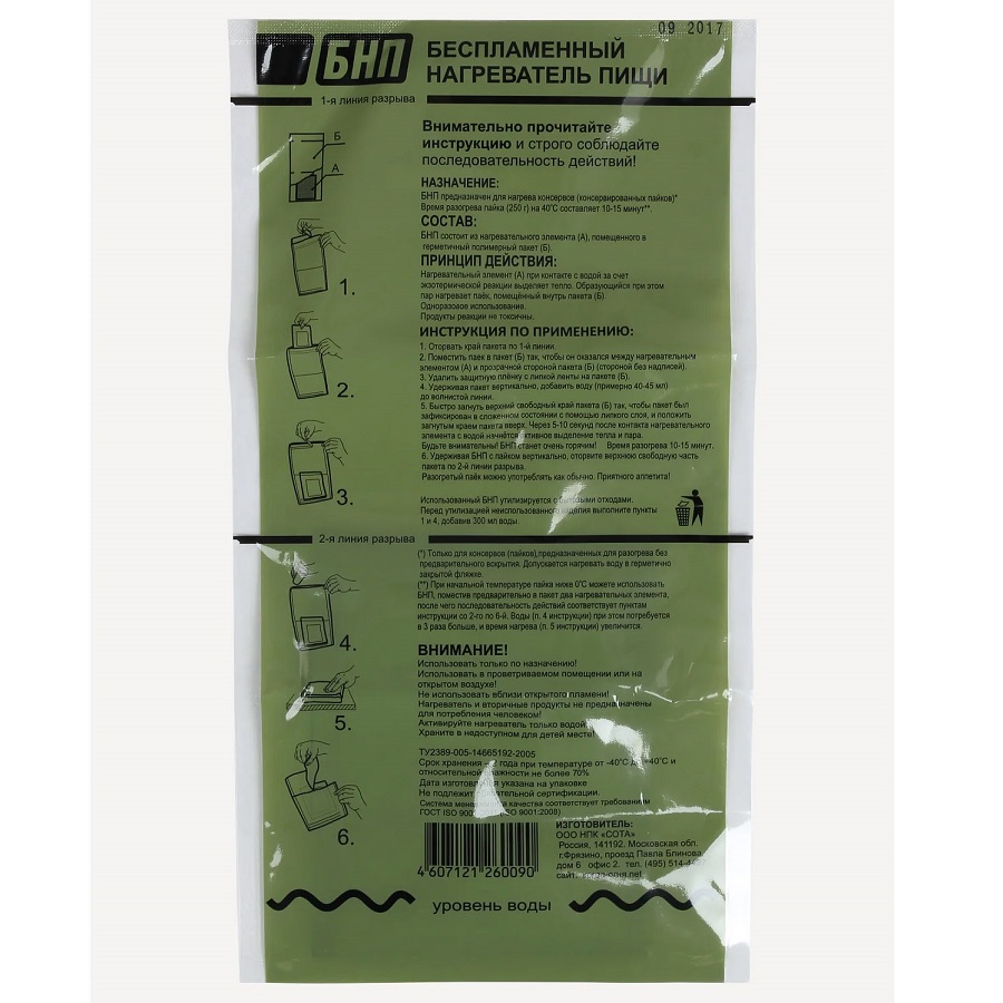 6. Использованный нагревательный элемент вынуть из пакета и утилизировать с бытовыми отходами. Остаток воды, после подогрева, не использовать для питья.