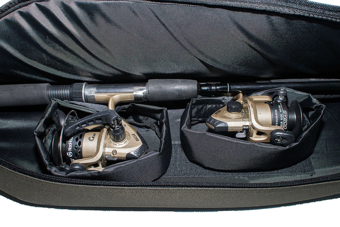 Жесткий чехол обеспечивающий надежное хранение 1-2 снаряжённых спиннингов. Сохранность катушек обеспечивают дополнительные карманы, положение которых может быть отрегулировано под конкретную модель спининга (они крепятся к дну чехла с помощью липы). Чехол снабжён ручкой для переноски и съемным регулируемым ремнём рюкзачного типа. Дно чехла защищено резиновым "стаканом".