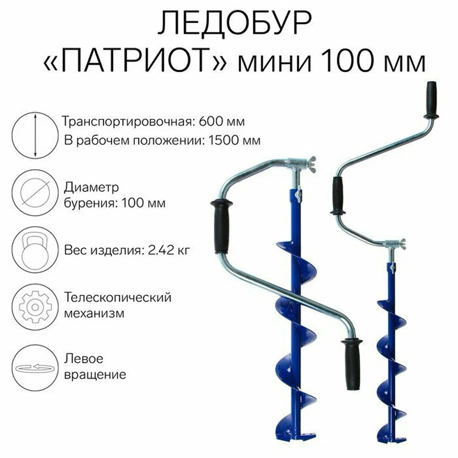 Характеристики Ледобур мини ПАТРИОТ телескоп Ф100мм (левое вращение)