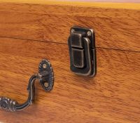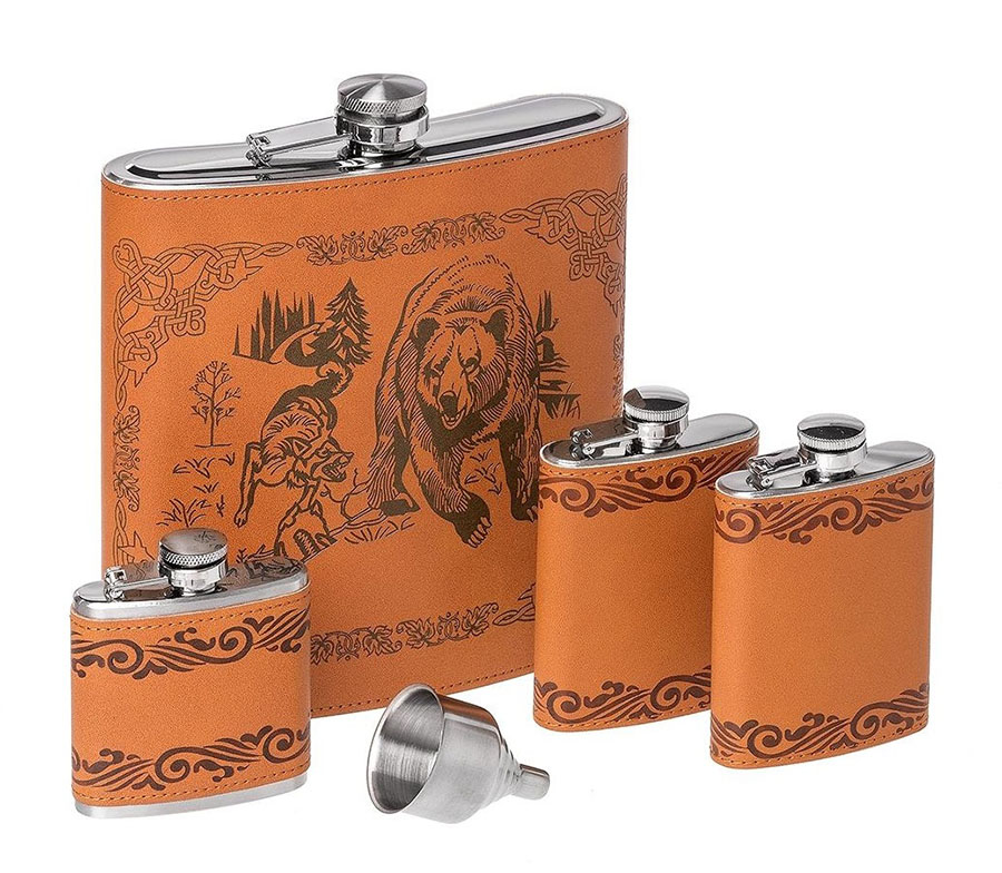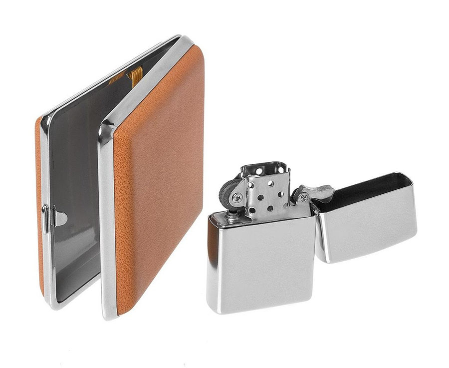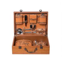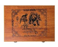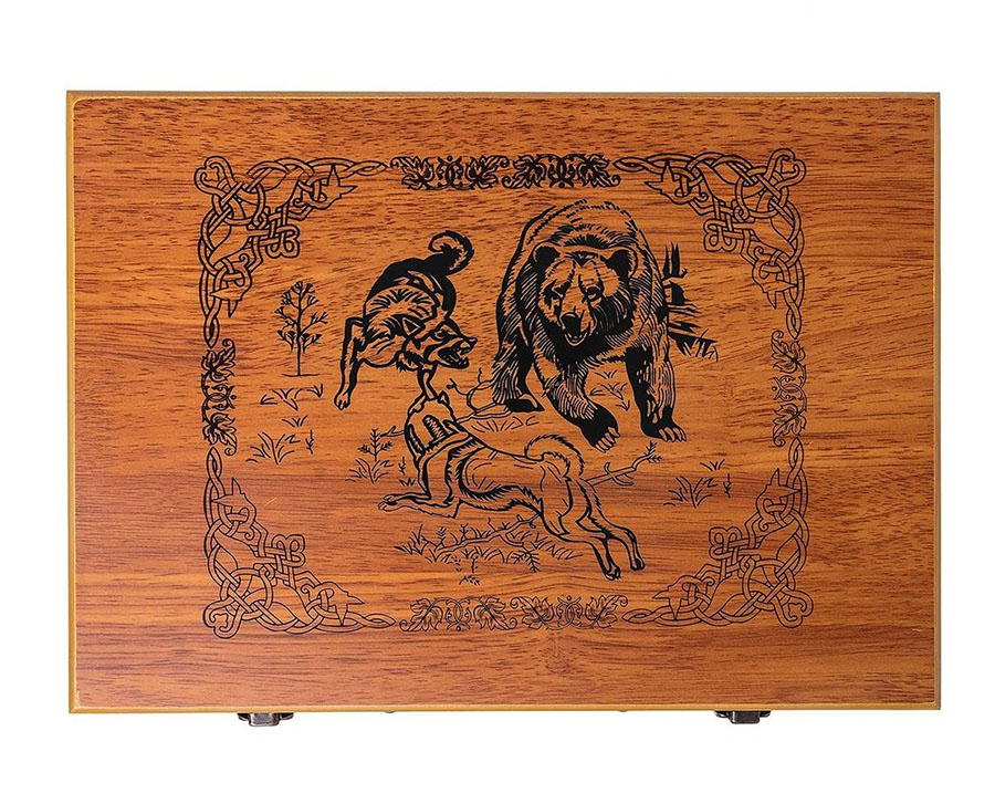 Подарочный набор в деревянном чемодане. Поверхность чемодана покрыта лаком, нанесен рисунок и узор. Чемодан закрывается на защелки, имеет удобную ручку. Внутри крышка чемодана оснащена фиксаторами на кнопке для предметов набора. Имеется дополнительный фиксатор, предназначенный для салфеток*.