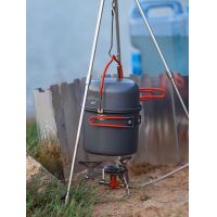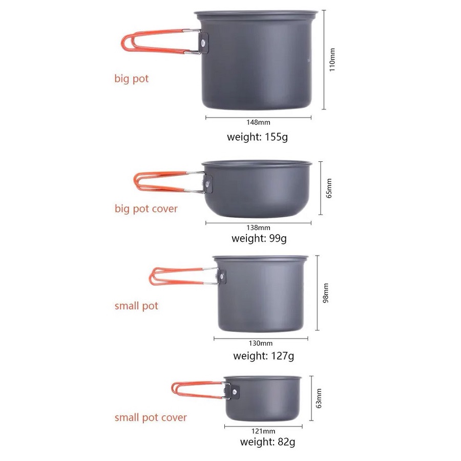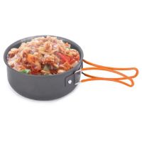 Набор посуды для походов и кемпинга изготовлен из анодированного алюминия, благодаря которому еда не пригорает.
