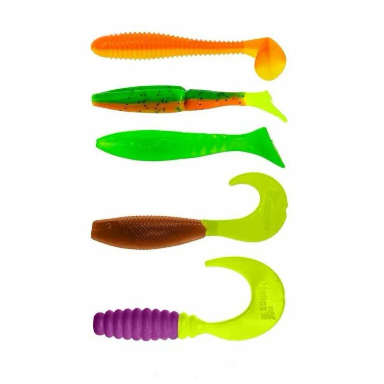 В набор входит пять приманок двух форм виброхвост и твистер: