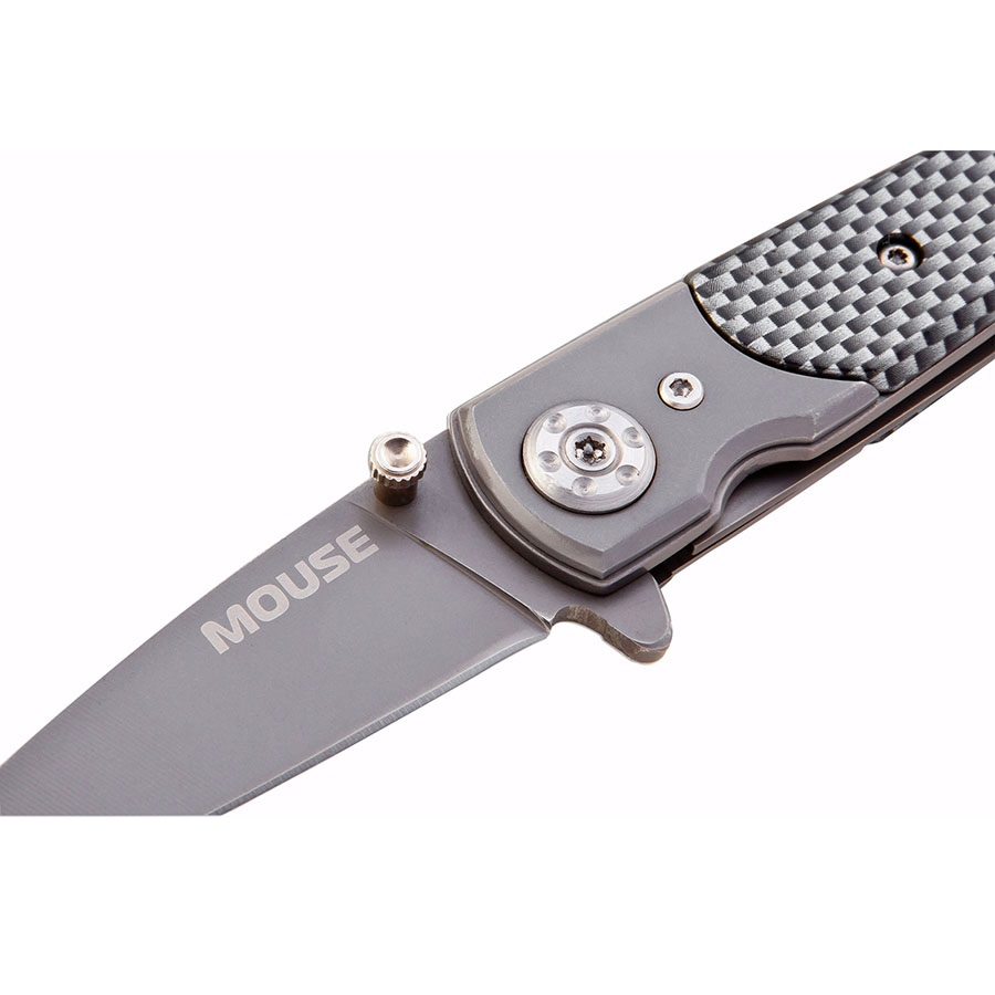 Mouse A-143 – компактный складной нож карманного типа, прозванный плавником (флиппером) ввиду своей отличительной формы: массивной пластиковой рукояти, стилизованной под карбон, и короткого клинка (65 мм). Изделие по достоинству оценят и опытные владельцы холодного оружия, и любители. Ярко выраженный подпальцевый упор, небольшие габариты, нержавеющая сталь 440 марки и эффектная шахматная расцветка рукояти – все это выгодно отличает оружие от его собратьев.