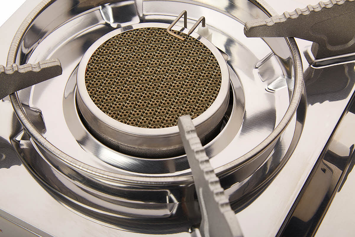 Компактная плита с керамической конфоркой. Особые преимущества керамики: отсутствие открытого пламени, снижение расхода газа более чем в 2 раза, более эффективная генерация и распределение тепла за счет полного сжигания газа.