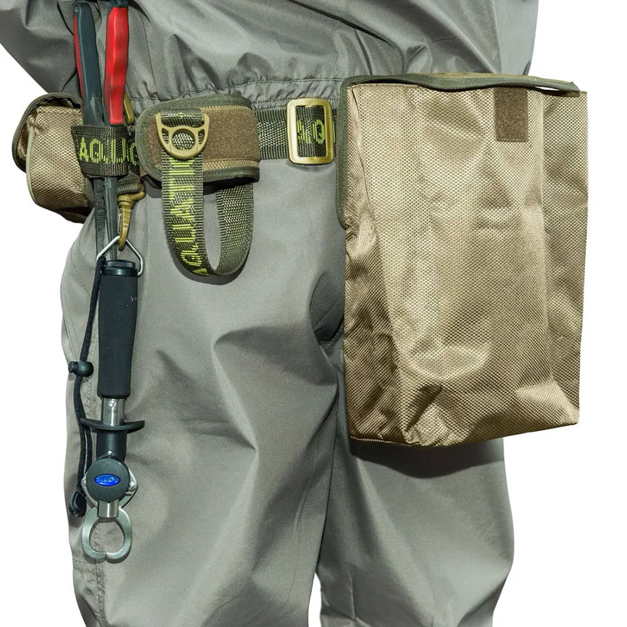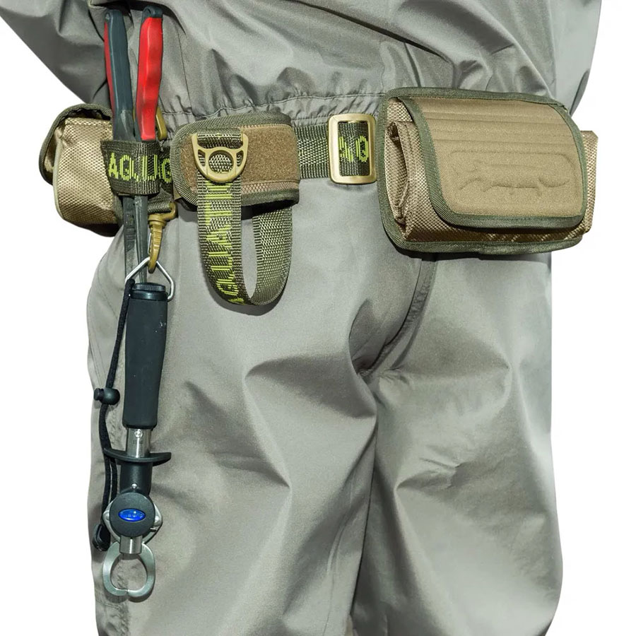 Это самая компактная модель пояса, но в ней предусмотрены все необходимые для рыбалки крепления и карманы: для фляги с водой, инструмента, очков, пойманного улова и так далее.