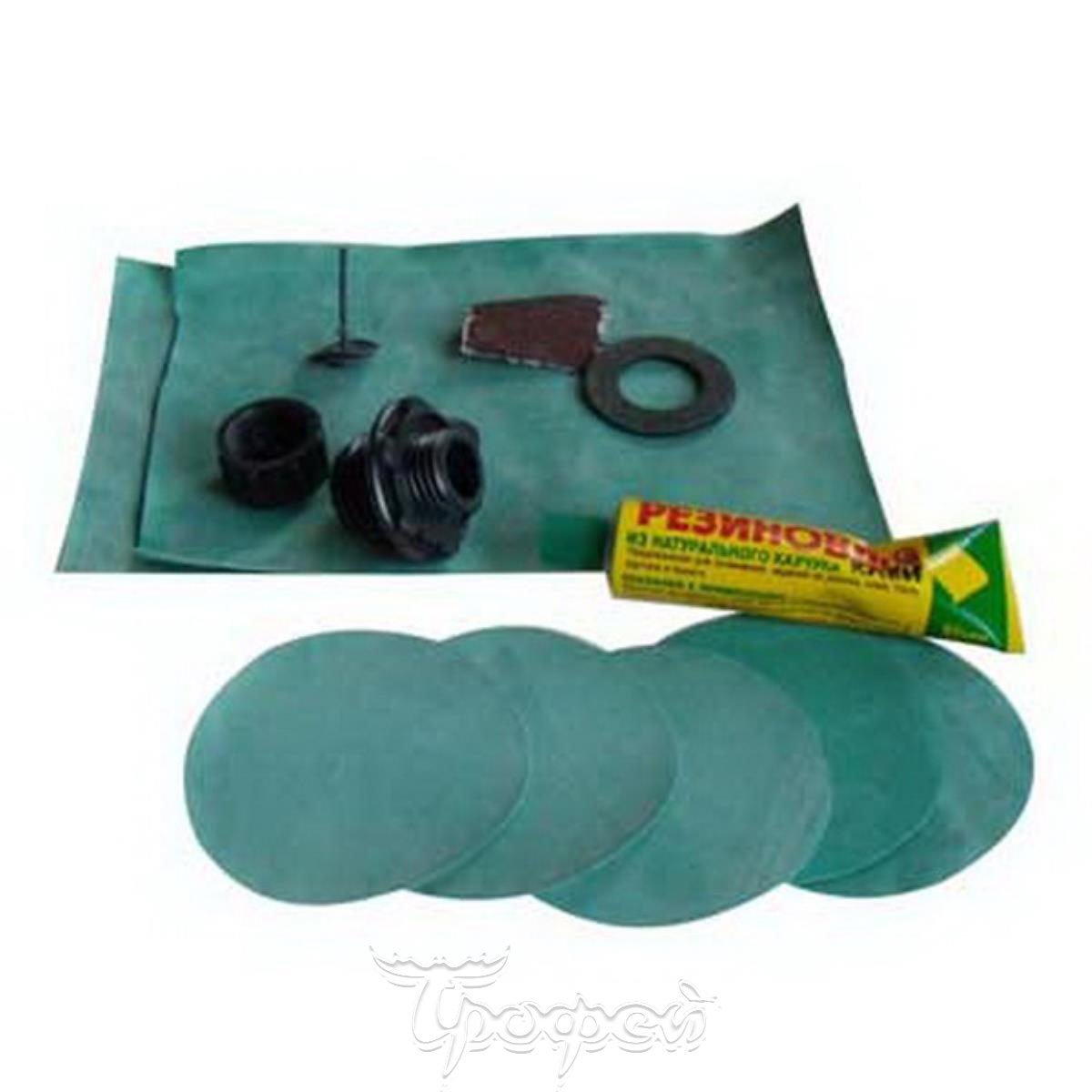 Необходимые аксессуары для ремонта резиновых лодок. В комплекте: ткань прорезиненная, клей резиновый марки А, шкурка шлифовальная, шайбы из прорезиненной ткани D50мм и D80мм, корпус вентиля, крышка вентиля, прокладка для корпуса вентиля, прокладка для крышки вентиля, клапан резиновый.