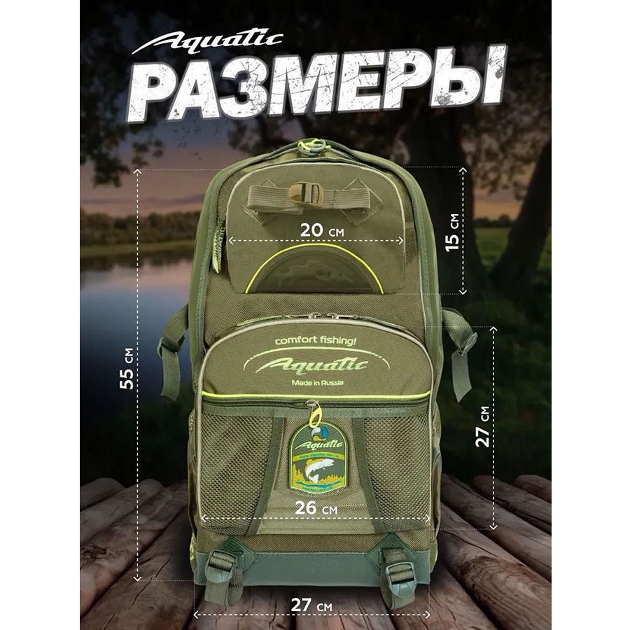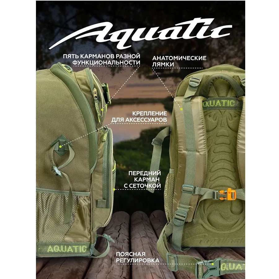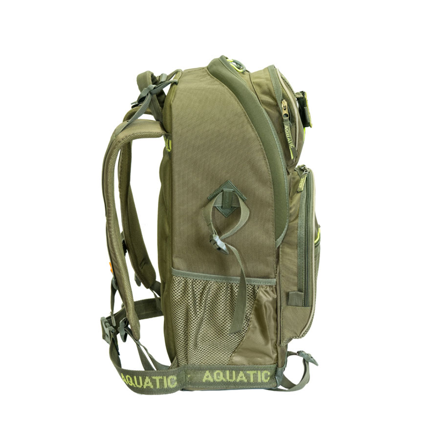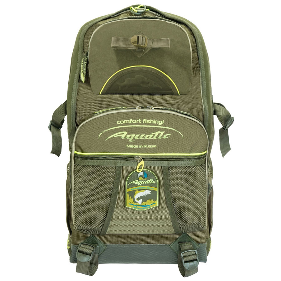 Самый популярный у рыбаков рюкзак Aquatic объёмом 40 литров изготавливается из качественных непромокаемых материалов. Состоит из основного отделения, защищенного от влаги неопреновой лентой, и 5 наружных карманов разной функциональности. На рюкзаке возможно закрепить габаритные вещи: тубус, туристический коврик, теплые вещи и прочее. Рюкзак имеет грудную регулировку и уплотненную спинку.